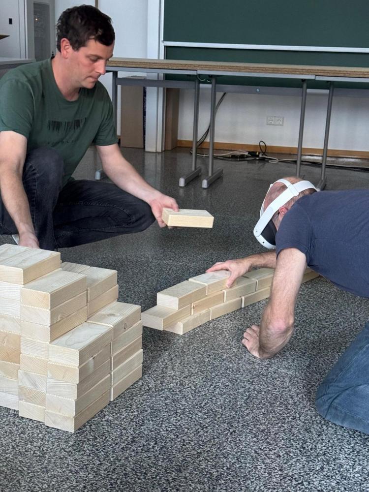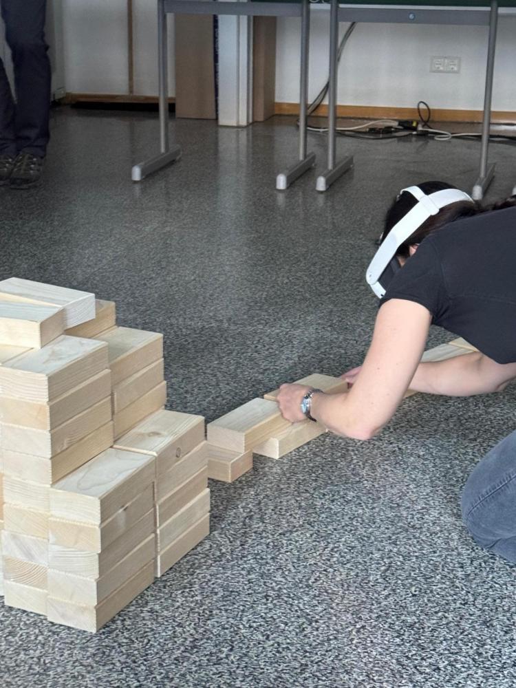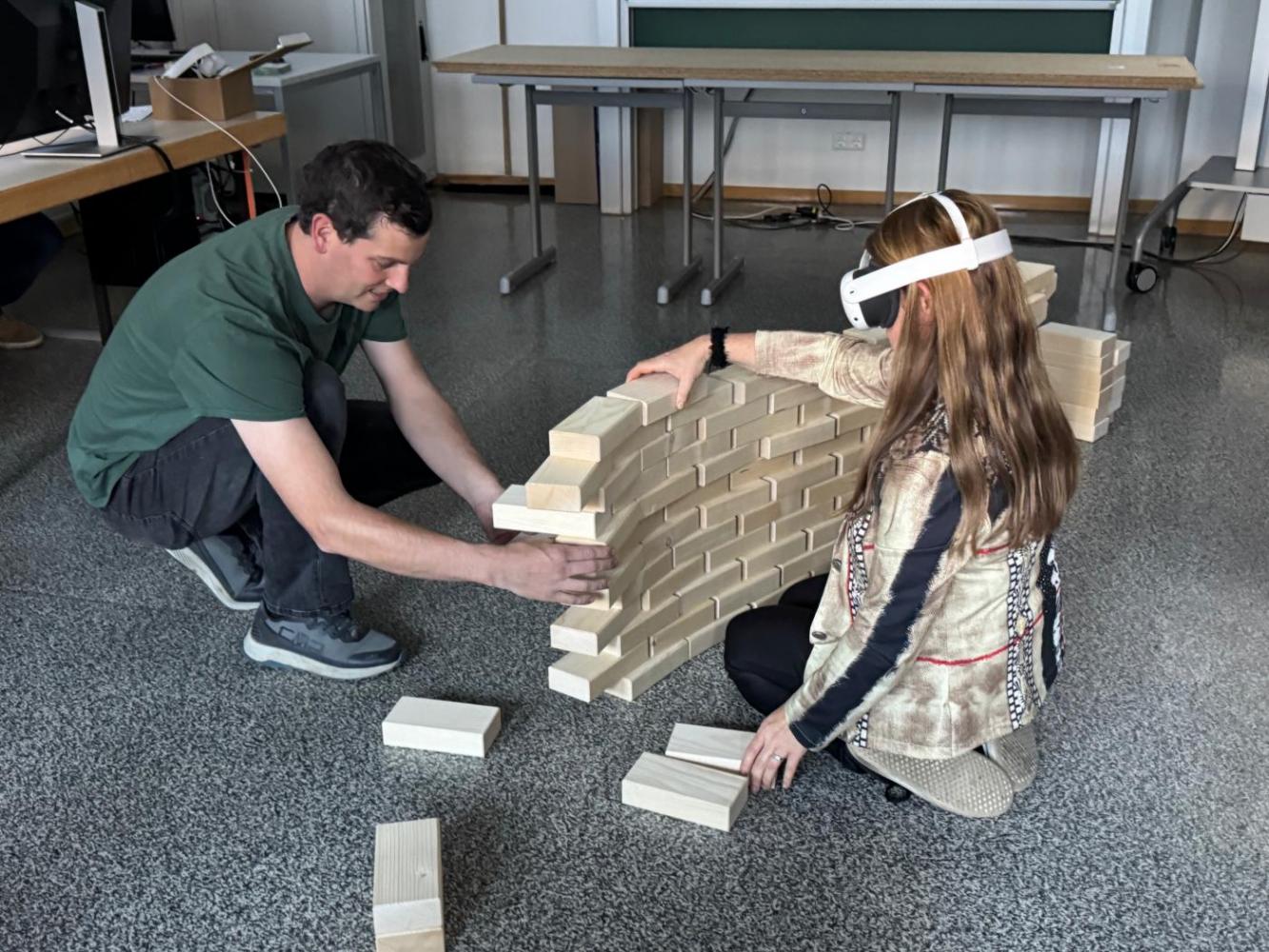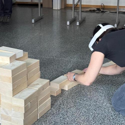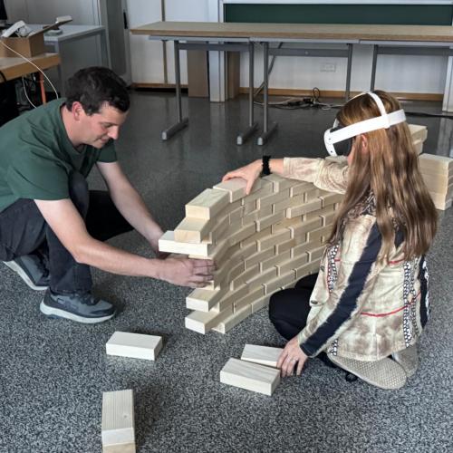 Kreative Lösungen für reale Problemstellungen mit einem wertvollen Einblick in die Arbeitswelt von morgen, so die Aufgabenstellung auch für die Lehrpersonen, die, ausgestattet mit einer Mixed Reality-Brille, eine in mehreren Dimensionen gekrümmte Mauer aus Holz-Ziegeln erbauen durften.