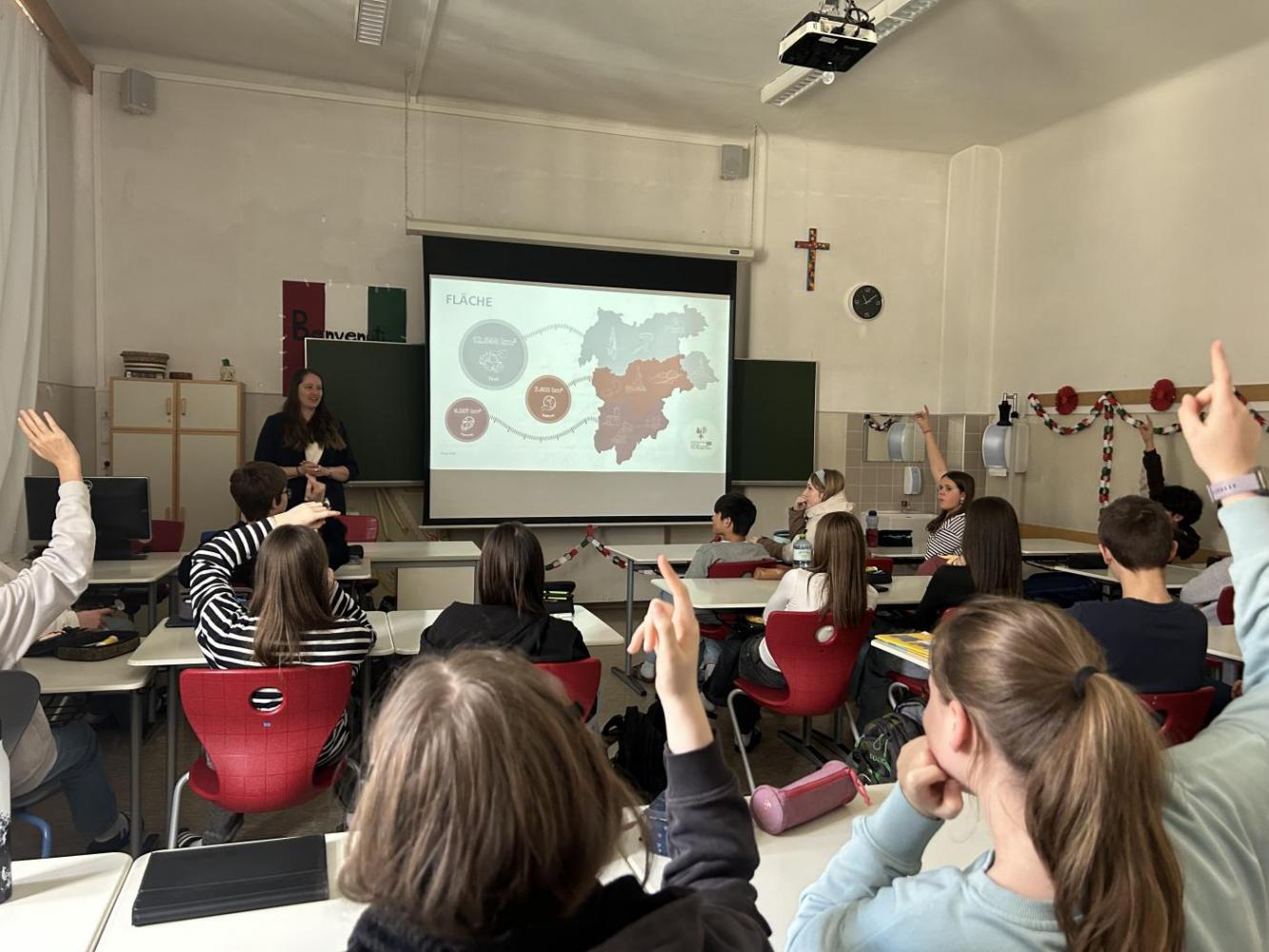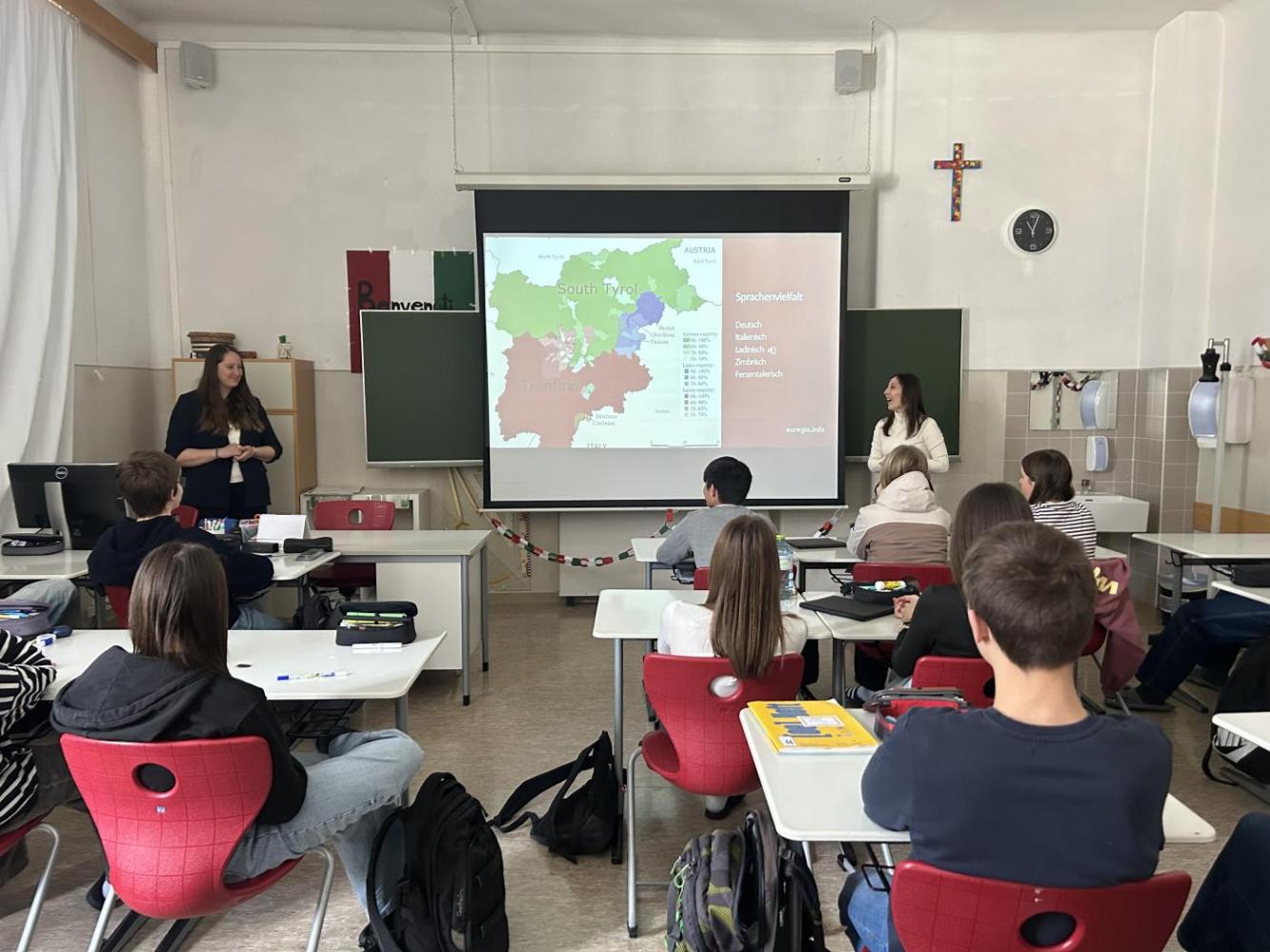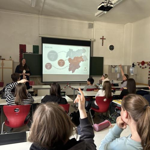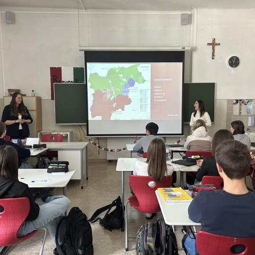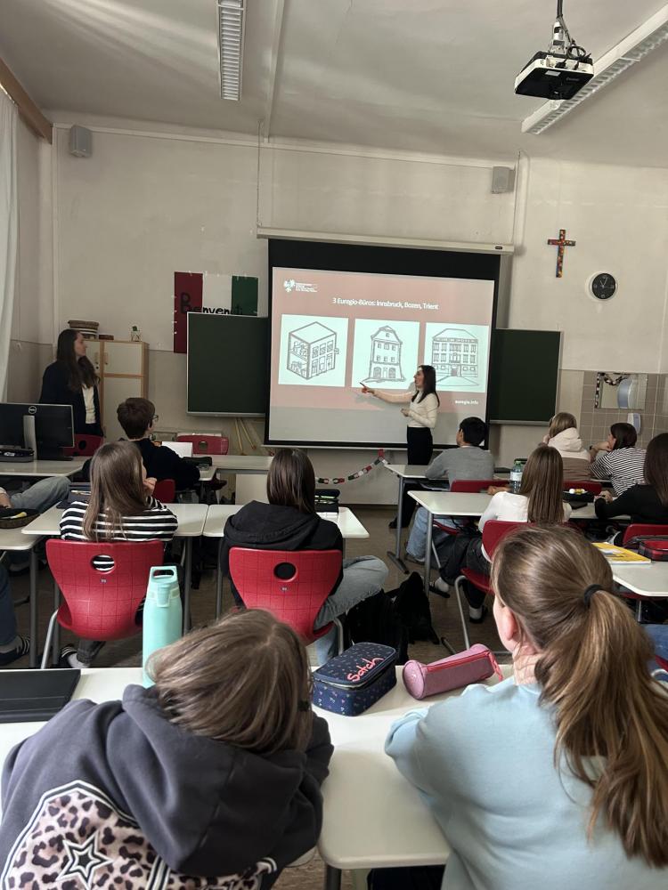 Am 23. Februar durften wir Frau Ramoser, Frau Steger und Herrn Steinegger vom Euregio-Büro Innsbruck an unserer Schule willkommen heißen. Mit einem lebendigen und zugleich informativen Vortrag nahmen sie unsere 4i Schülerinnen und Schüler mit auf eine spannende Reise durch die vielfältigen Wirkungsbereiche der Euregio Tirol-Südtirol-Trentino. Bereits der Einstieg mit humorvollen Memes sorgte für gute Stimmung, bevor Themen wie Sprachenvielfalt, Mobilität, das EuregioSportCamp und das Jugendblasorchester anschaulich vorgestellt wurden.