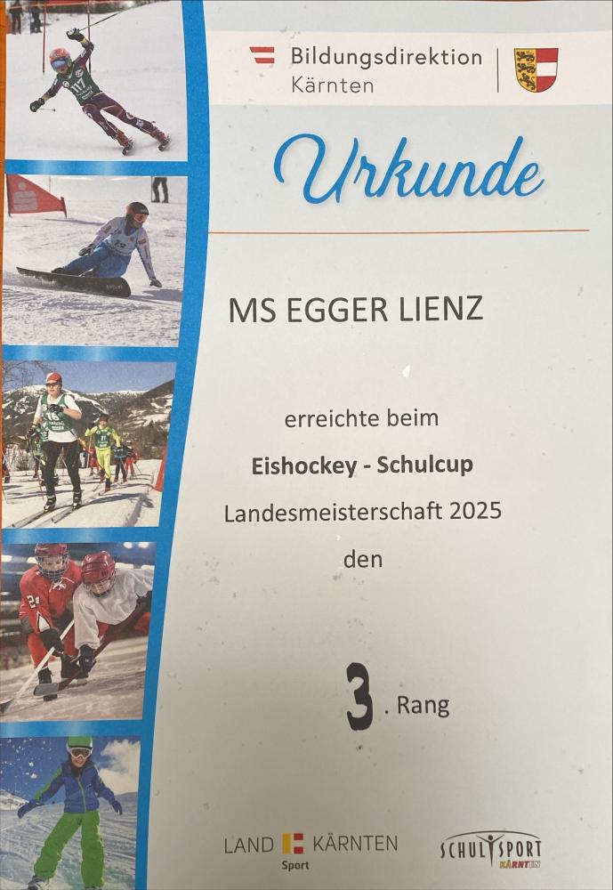 Das Eishockey-Team der MS Egger Lienz nahm mit großem Engagement und Teamgeist am diesjährigen Eishockey-Schulcup in Spittal teil. Unsere Schülerinnen und Schüler zeigten in spannenden Spielen, dass Leidenschaft und Fairness den Sport erst richtig lebendig machen. Mit beeindruckender Leistung und Einsatzfreude überzeugte das gesamte Team und konnte nicht nur wichtige Erfahrungen sammeln, sondern auch in einem spannenden Wettbewerb den 3. Rang erreichen.