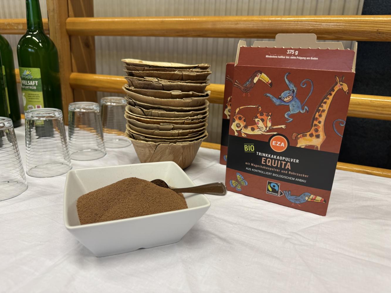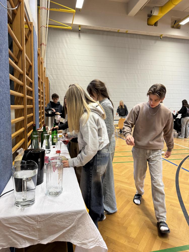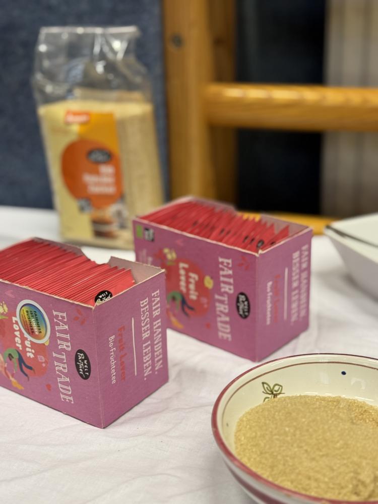 Im Turnsaal wurden verschiedenste fair gehandelte Produkte wie Kakao, Tee, Säfte, Brot, Aufstriche und Obst angeboten. Ziel der Veranstaltung war es, den Schüler:innen den Wert nachhaltiger und fairer Produkte näherzubringen und sie für eine bewusste Konsumhaltung zu sensibilisieren.