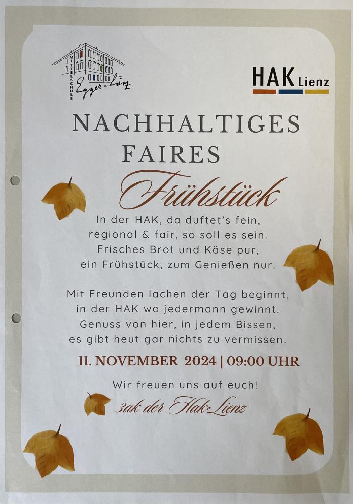 Am Montag, den 11. November 2024, fand an unserer Schule ein besonderes Frühstück statt: Gemeinsam mit der HAK Lienz organisierten wir ein Frühstück, das ganz im Zeichen des fairen und regionalen Handels stand.