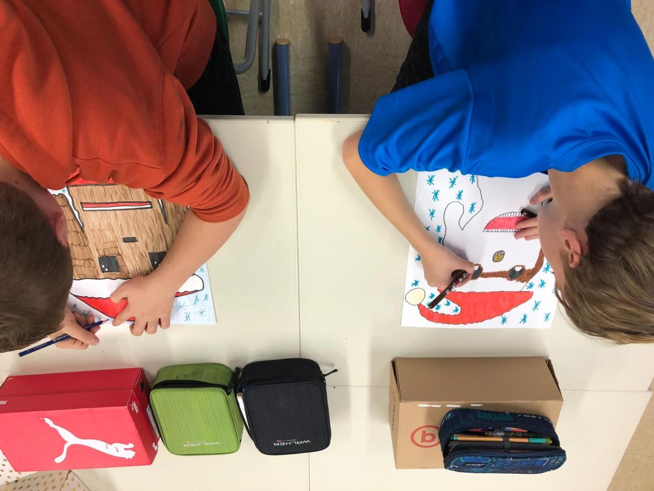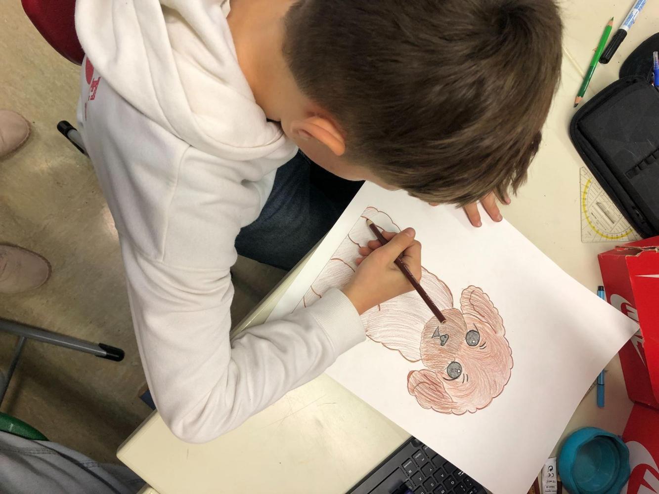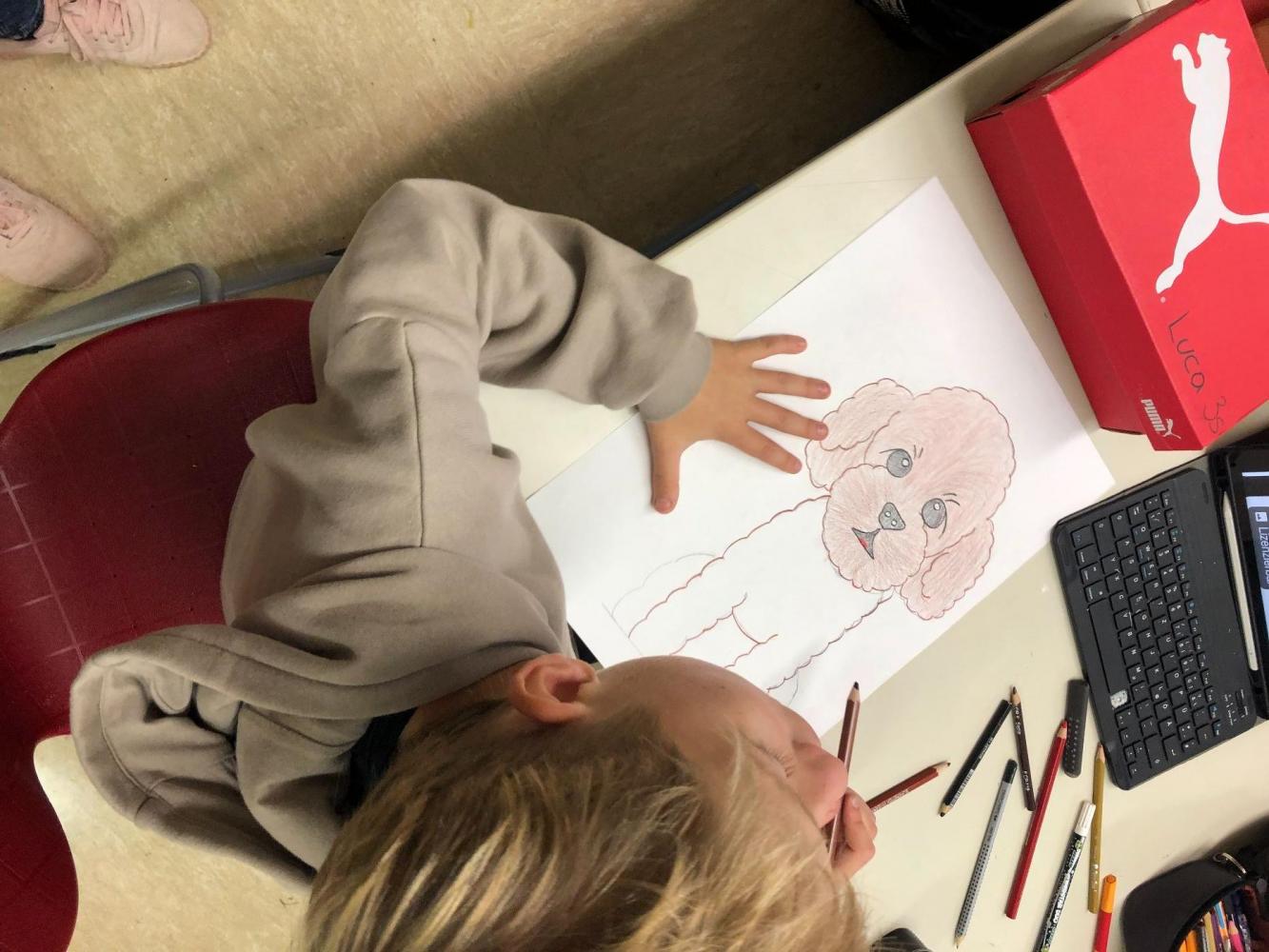 Im Zuge ihres vergangenen KuG-Unterrichts durften die SchülerInnen der 3s einen Überraschungsgast empfangen. Der braune Zwergpudel diente als Model und wurde weihnachtlich inszeniert - zwischen Malen und kreativem Gestalten blieb auch noch ausreichend Zeit mit Hugo zu kuscheln und ihn zu streicheln.